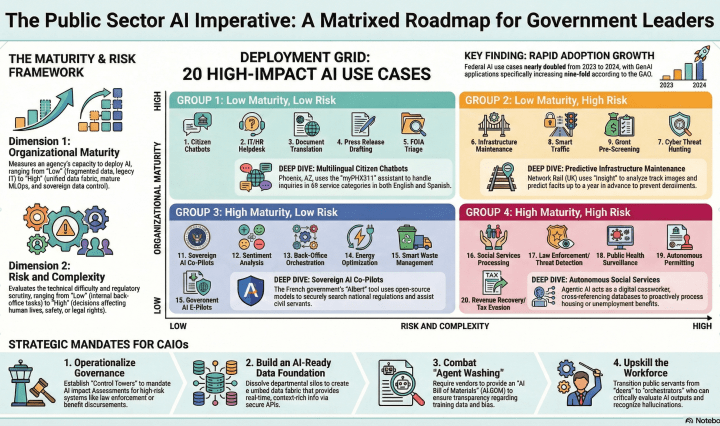 The integration of artificial intelligence into public sector operations has reached a critical inflection point. As federal and municipal governments across North America and Europe face mounting macroeconomic pressures, stringent budget constraints, and citizen expectations molded by seamless private-sector digital … Continue reading Research: 20 Transformative AI Use Cases for Federal and Municipal Leaders