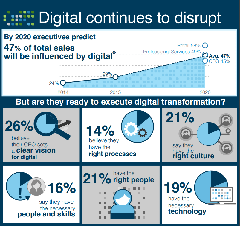 Forrester in their “The State Of Digital Business 2015 To 2020” reported that only an average 20% of organizations have the right culture, processes, people, skills, and technology to successfully execute their digital transformation (figure below).