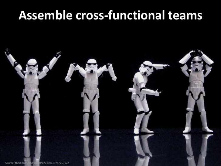 Organizing into-cross functional teams significantly reduces the number of handoffs, decreases delivery time, and generally creates higher quality product. The idea is to form dedicated squads or teams that can deliver the product with minimal handoffs / dependencies outside them. Imagine forming a team that has an analyst, project manager, architect, developer, tester, and even operations person all in one team. Products are delivered through efficient collaboration within the team, not through artificial lengthy bureaucratic processes, handoffs, signoffs, etc. This approach is simply more efficient, no matter your organizational structure or even your process (PMI / Agile / Prince2).