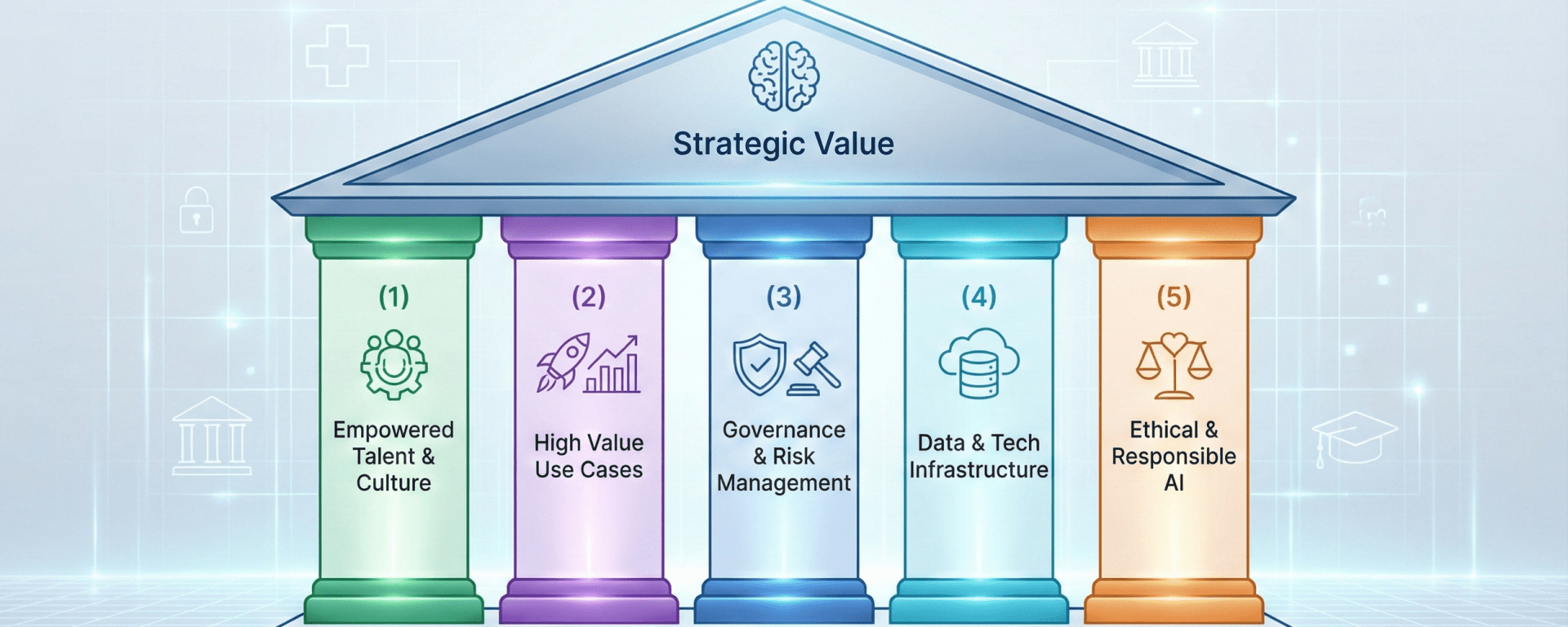 We place this pillar first for a reason: AI is a tool, but people are the engine. In banking and healthcare, legacy processes run deep. Transformation requires an Empowered Talent & Culture that embraces augmentation over replacement. This means upskilling not just data scientists, but the compliance officers, nurses, and loan adjudicators who will work alongside these models daily.