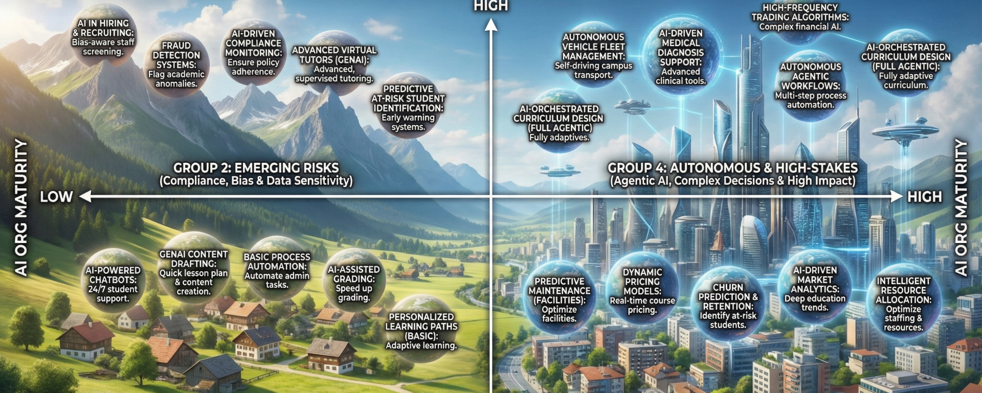 - Low Maturity / High Risk: The “Danger Zone” where governance gaps lead to reputational damage (e.g., automated grading).