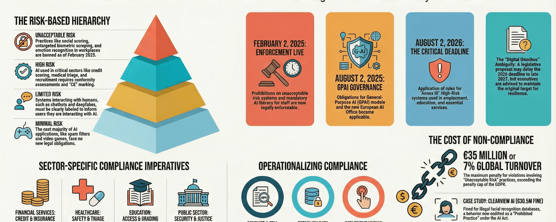 As of February 2026, the global regulatory landscape for artificial intelligence has shifted from a period of anticipation to one of active enforcement. The European Union Artificial Intelligence Act (EU AI Act), the world’s first comprehensive legal framework for AI, is no longer a theoretical compliance target but an operational reality. For executives leading organizations in regulated sectors—finance, healthcare, education, nonprofit, and government—the implications are profound, immediate, and extraterritorial. This report provides an exhaustive analysis of the Act’s requirements, tailored specifically for leaders in Europe and North America who must navigate this complex new environment.