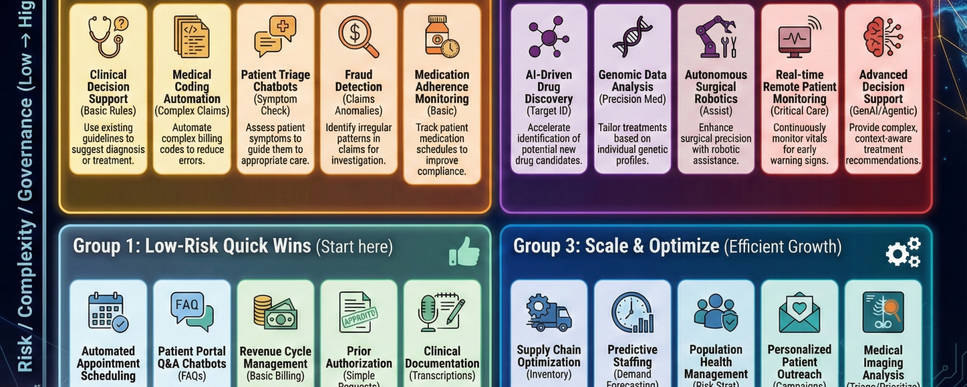 This quadrant represents the “North Star” of healthcare AI—applications that are high-stakes, life-critical, and require the most advanced levels of organizational maturity, technical rigor, and regulatory alignment.