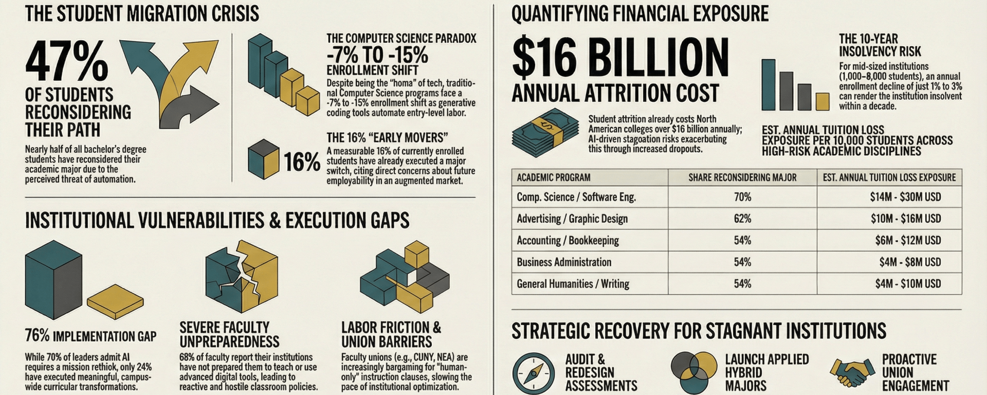 When a student abandons an institution because they perceive their degree as outdated, the university loses the compounding lifetime value of that student’s tuition, campus housing fees, and future alumni contributions.6 For mid-sized private institutions with enrollments between 1,000 and 8,000 students, standard modeling suggests that an annual enrollment decline of just 1% to 3% can render an institution insolvent within a decade.25 The current wave of student panic, if not met with rapid program modernization, risks turning thousands of those students into dropouts or prompting them to seek short-term, job-secure certifications elsewhere, draining the vital revenue needed to keep campuses operating.2