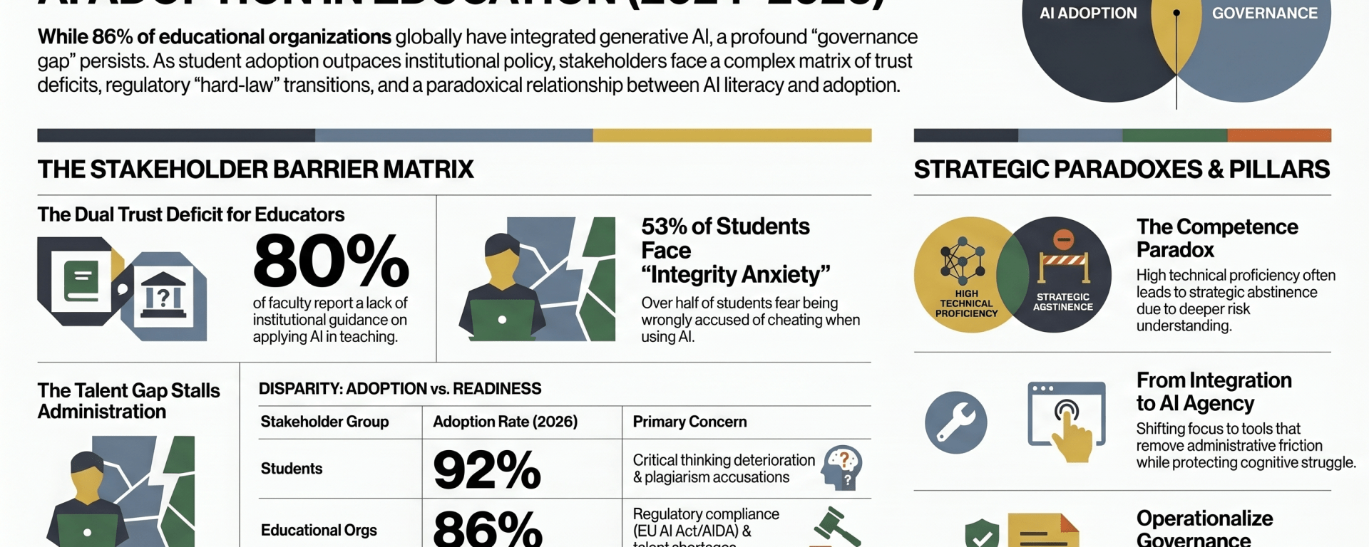 This report identifies a complex matrix of barriers across three primary stakeholder groups. Educators are largely hindered by a “dual trust deficit”—a technological skepticism regarding the reliability of AI outputs (hallucinations) and an institutional anxiety concerning the erosion of academic integrity and student critical thinking.5 Students, while high-frequency users, face a “shadow literacy gap” where socioeconomic status dictates whether AI is used for deep cognitive scaffolding or superficial automation, alongside a pervasive fear of being falsely flagged by unreliable plagiarism detection systems.4 Administrators are stalled by a critical shortage of AI-ready talent and an increasingly complex regulatory environment, particularly the transition from “soft-law” guidelines to “hard-law” compliance regimes such as the European Union’s AI Act and Canada’s Artificial Intelligence and Data Act (AIDA).8