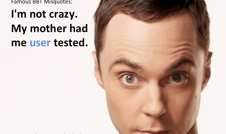 “I’m not crazy. My mother had me user tested.” The Big Bang Theory misquoted Explanation: There is a difference, isn’t there? It’s a lot harder to rig user testing to our advantage, especially when testing complex functionality (or people). Users … Continue reading Famous BBT Misquotes – User Testing