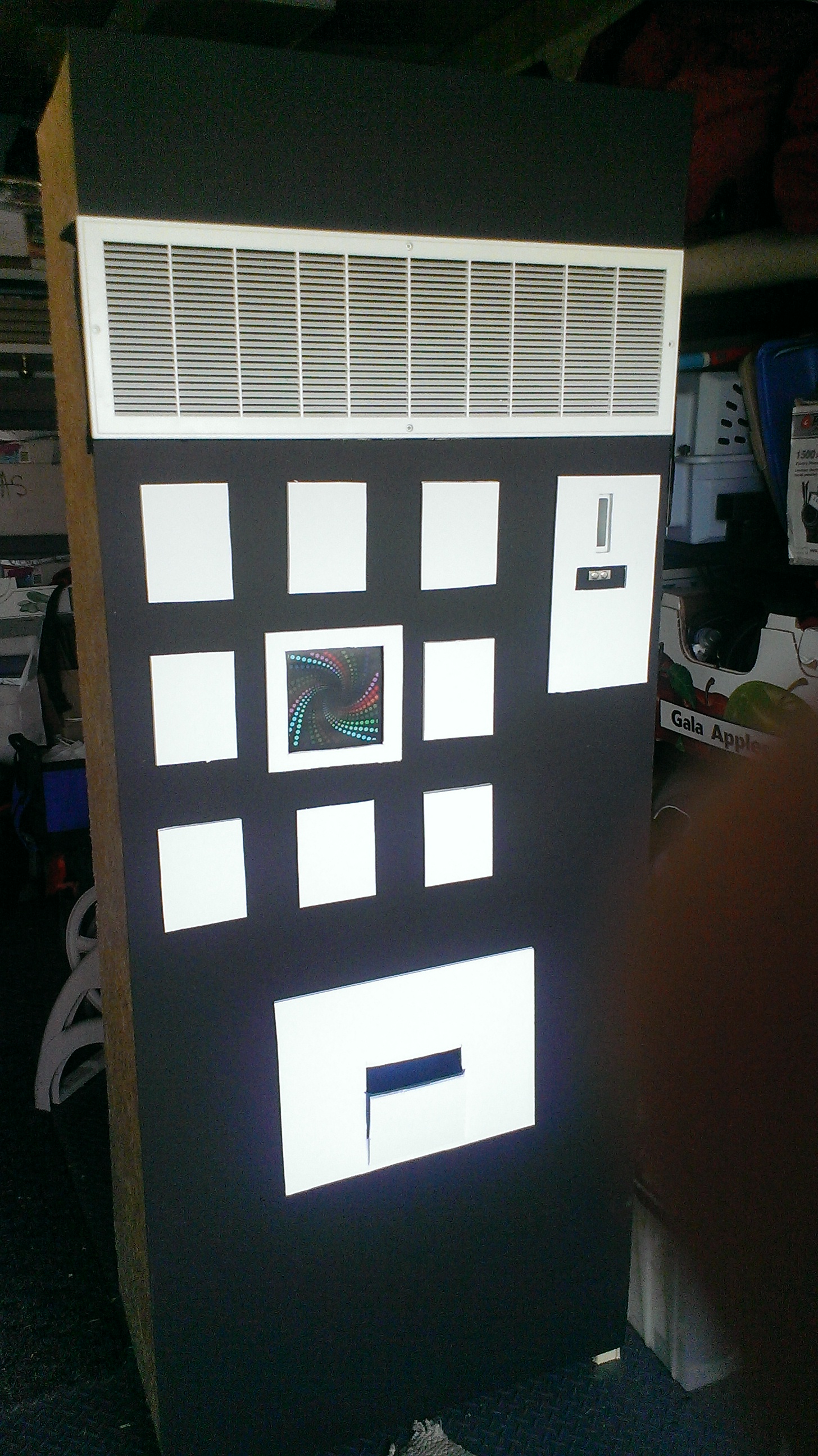 The core of this design is a box large enough to fit me inside and a front panel resembling a vending machine.