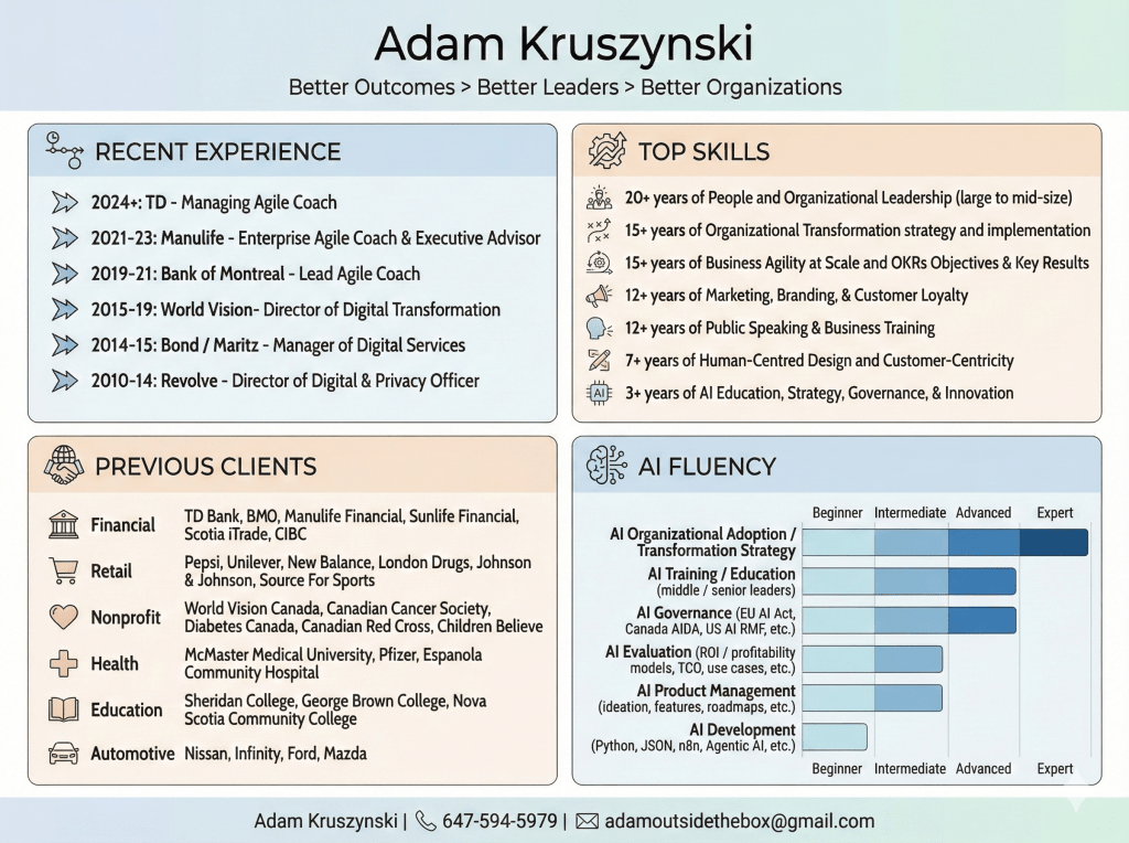 | Enterprise Agile Coach & Executive Advisor @ Manulife – Global Agile Office (12 months contract + multiple extensions) August 2021 to October 2023 |